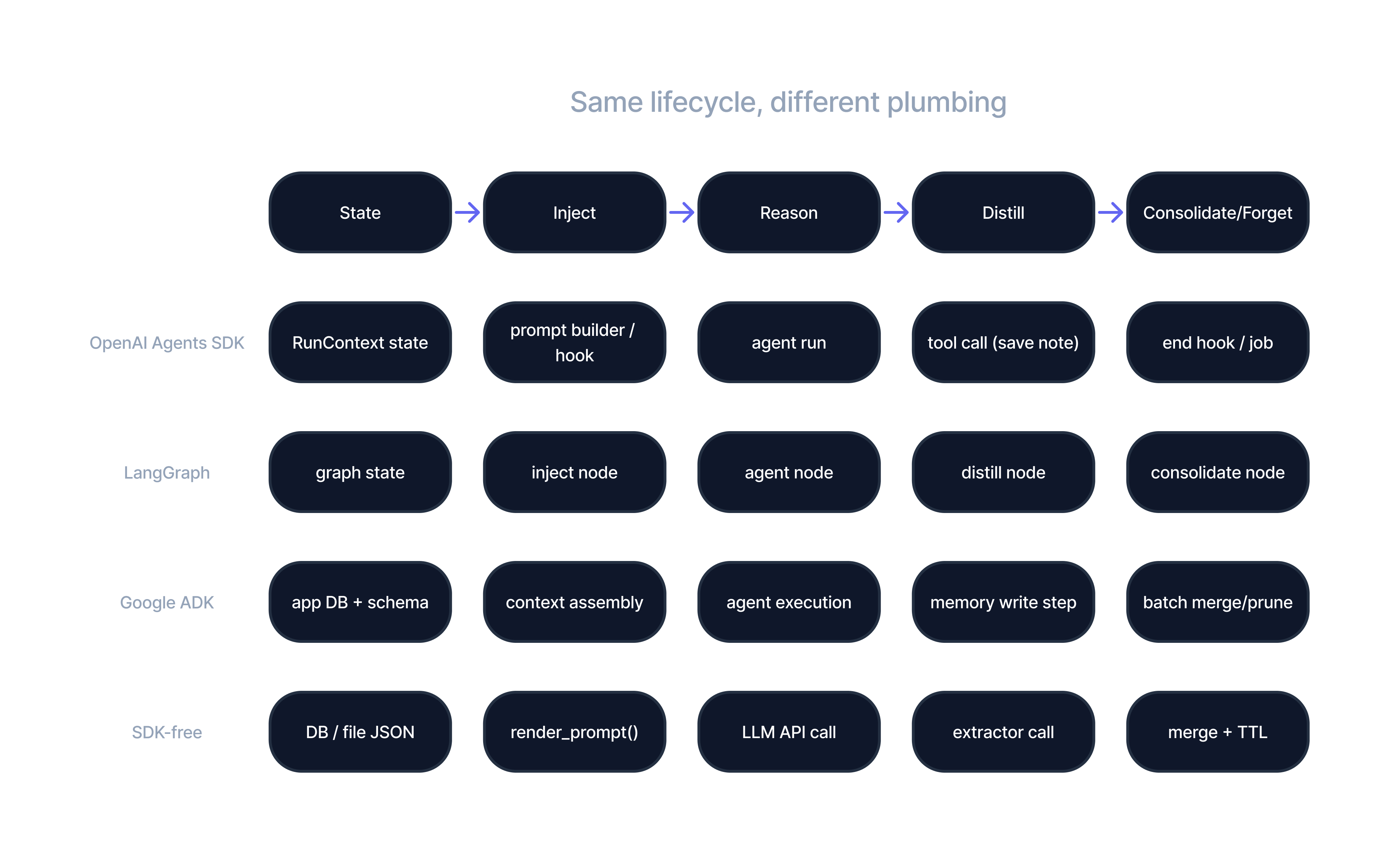 Figure B: The same memory lifecycle mapped across OpenAI Agents SDK, LangGraph, Google ADK, and a minimal SDK-free implementation.